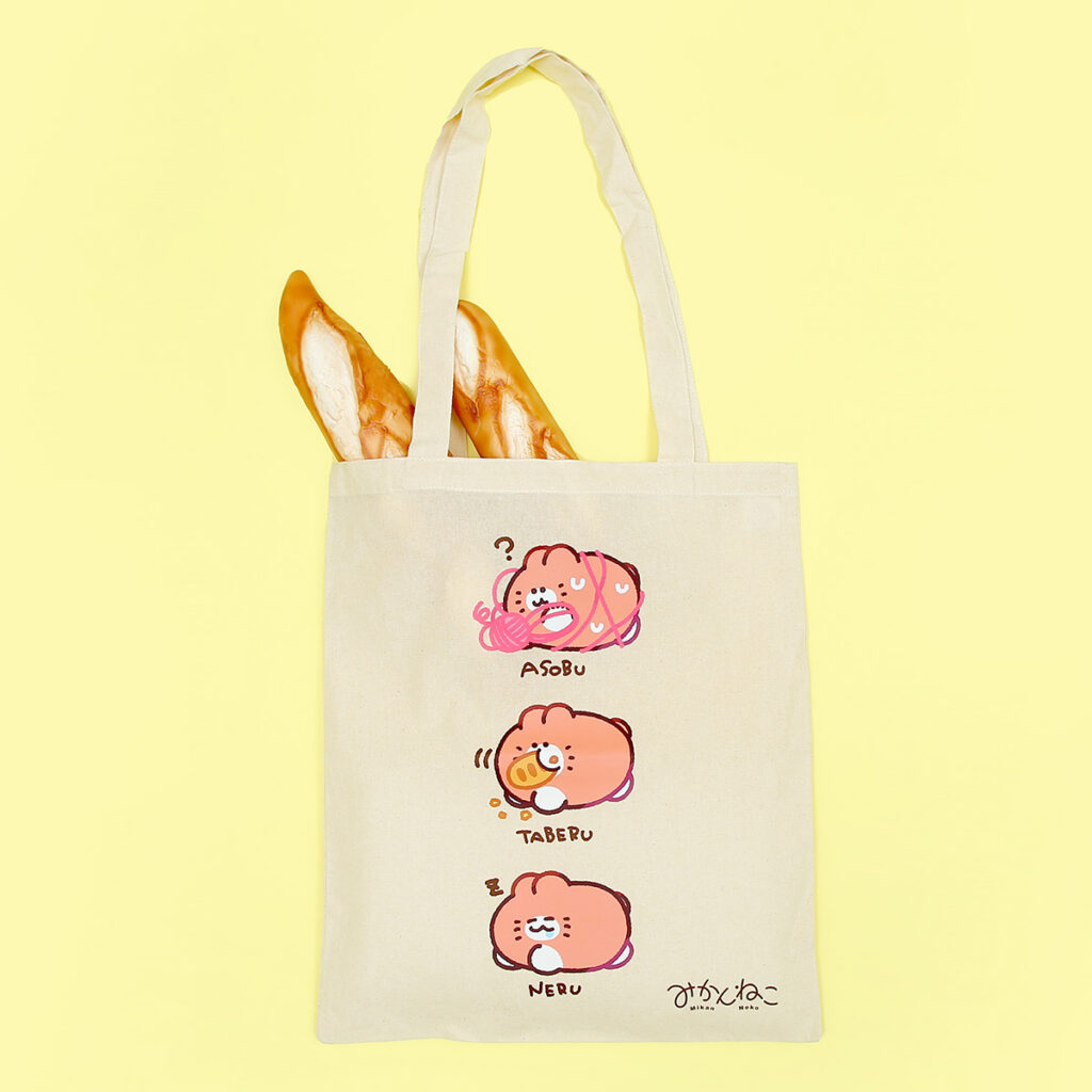 ■ みかんねこトートバッグ「あそぶ たべる ねる」 ¥2,500(税込)